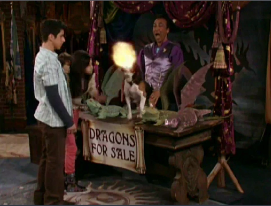 The episode opens with the Russo kids and a goat. It's shown that they used a spell to turn their dad into a goat. They change him back. An angry Jerry punishes them with more studying. After he leaves the basement, Alex opens a briefcase to reveal a laptop that sells magical objects. She tries to find clothes, but then summons a store that sells pet dragons. Justin finds a "dog" in the store and wants it. The shopkeeper tries to sell it to them and gives Max a roll of quarters to stop him from being annoying. He says that it's a dragon dog that has been enchanted as a disguise. Justin hesitates after remembering the last time he had a dog. Alex complains that he's going to cry. Justin said that when he was 7, he had a dog that got lost. Alex just buys the dog and the store dematerializes. The dog burns Alex's homework by accident.