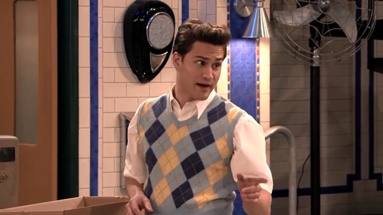 In 1957, Hank is a young Italian-American man of average height with brown hair styled in a pompadour typical of the era. His cheeks are relatively round, and he is tall and thin. He wears a 1950s waiter uniform consisting of a white shirt, white apron, black bow tie, and a soda jerker hat with a red stripe along the top.