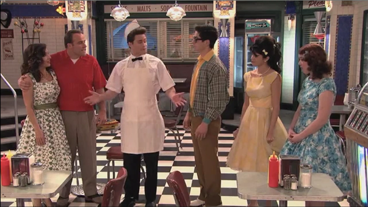 The Russos and Harper land in the year 1977 because Justin accidentally shifted the dial in the time machine. The Sub Station looks more like a dance club than a diner. They take a few minutes to dance before resetting the time machine to 1957 and attempting the trip again.