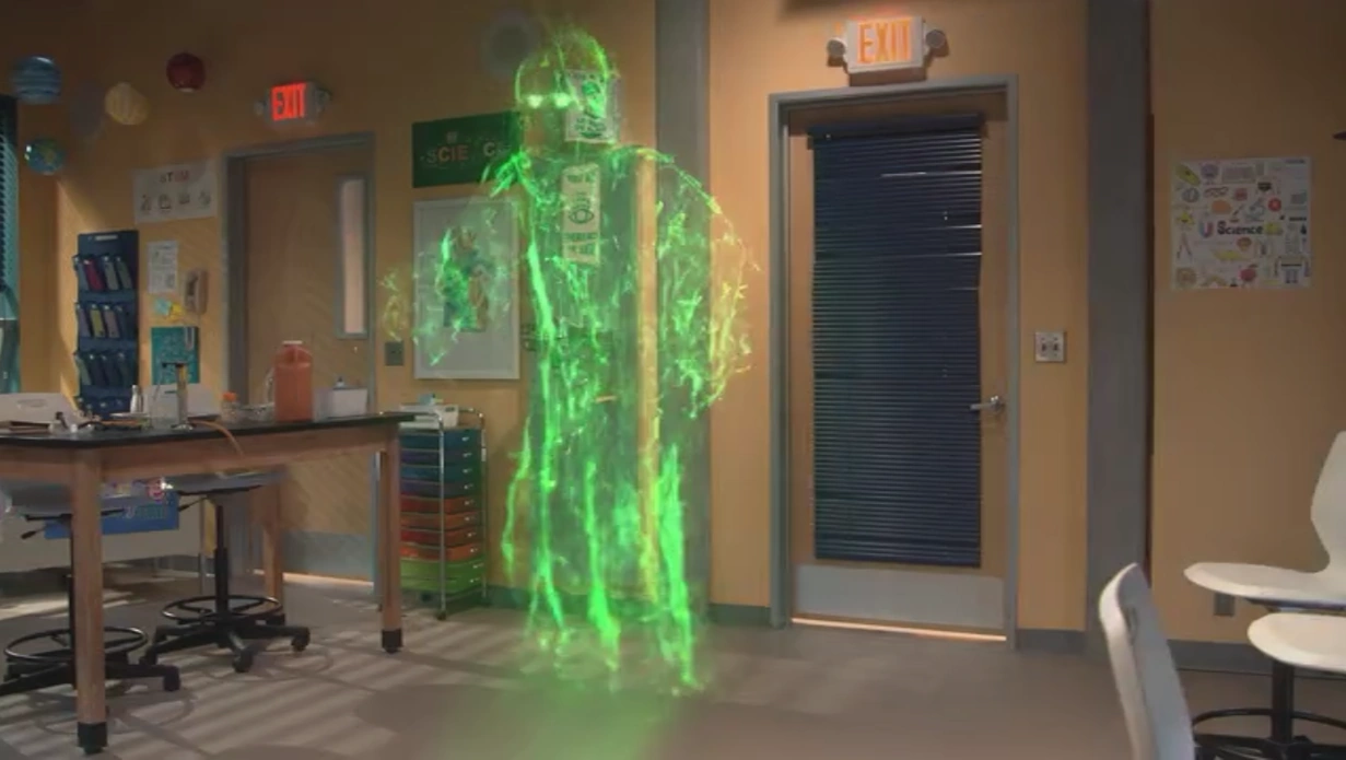 After Billie uses magic to conjure a burrito for Winter, the Phantomus emerges from the nearby vent as he has detected magic. Billie uses magic once more to make Winter's notebook appear and to get herself into honors science, Roman steals Billie's wand. After class, while Billie is trying to insist to Winter that she is in fact a wizard, the Phantomus emerges from another vent and hovers over Roman, as he stole Billie's wand. He possesses Roman and states that he belongs to the Phantomuses now. He levitates Roman while Billie and Winter try and get him down. As Billie declares she's the wizard and Roman isn't, the Phantomus releases him and tries to go after Billie. Roman looks for Billie's wand as he swirls around Billie. He threatens to bring Billie back to the Wizard World, where the Phantomuses will absorb her power, before beginning to possess her just as Roman finds her wand. Just in time, Justin and Giada emerge and Justin uses a spell to expel the monster. The Phantomus states now that Billie has been found, they will never stop coming for her. Before the monster gets away, Justin teaches Billie how to restrain it. Working together, the pair expels the monster into Giada's purse. Justin says he'll cast a protection spell on Billie and take the Phantomus to the lair.[2]
